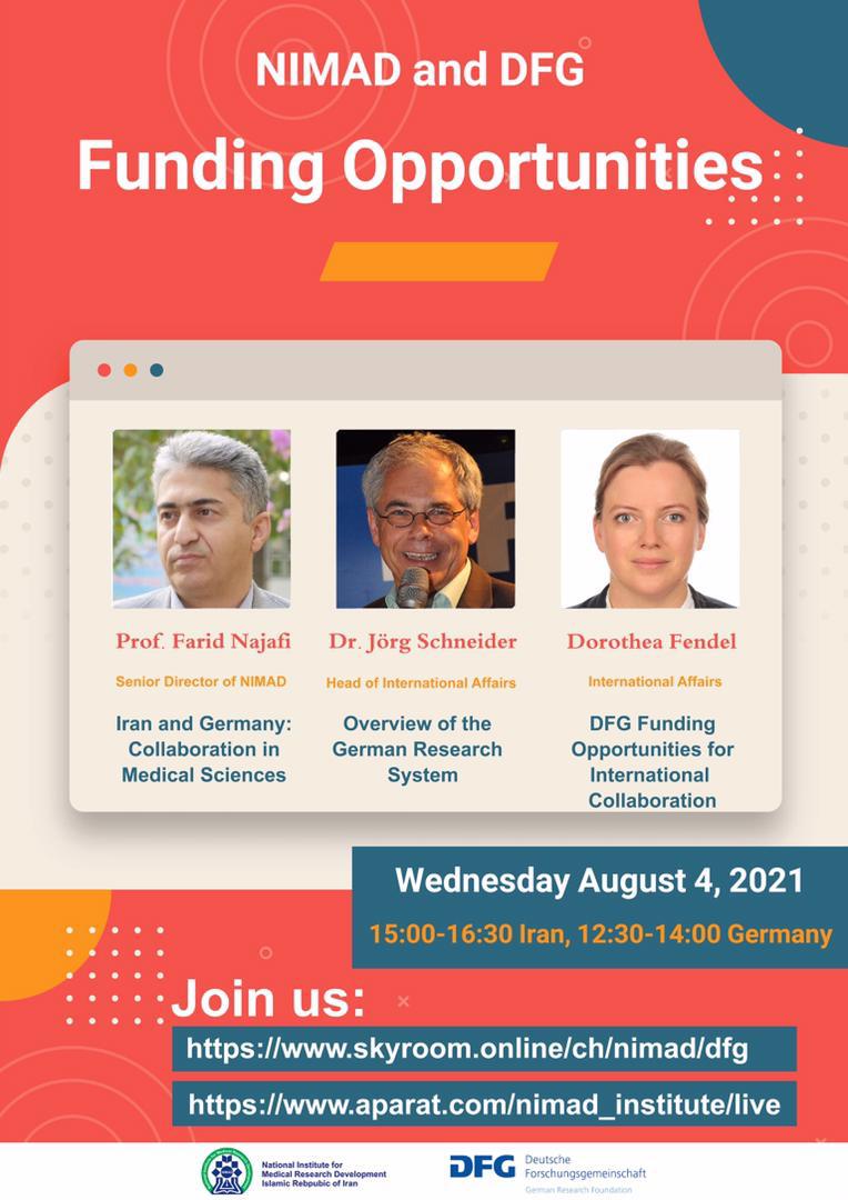 Funding Opportunities NIMAD and DFG: Funding Opportunities Funding Opportunities Join us: www.skyroom.online/ch/nimad/dfg www.aparat.com/nimad_institute/live کد خبر : 45650 کپی کلمات کلیدی : NIMAD DFG aparat dorothea fendel jorg schneider farid najafi Funding Opportunities